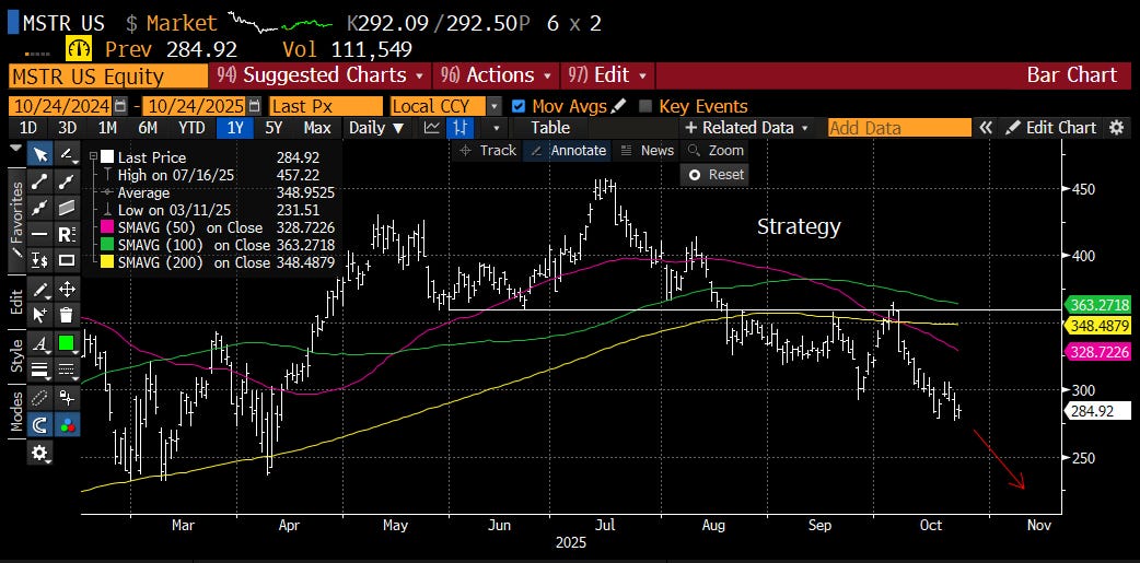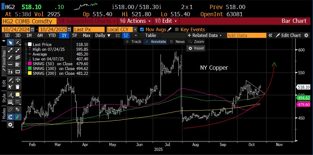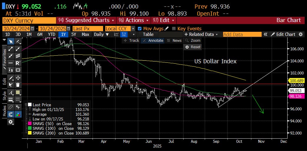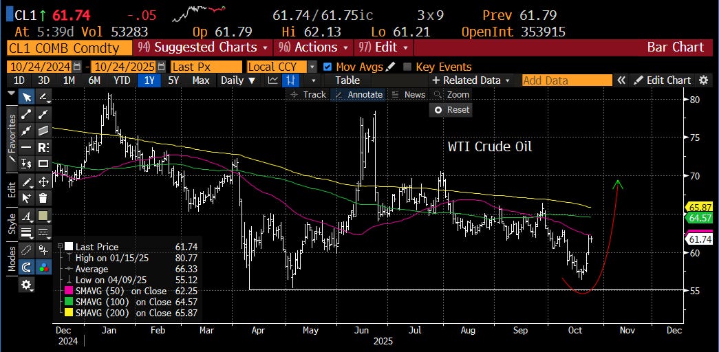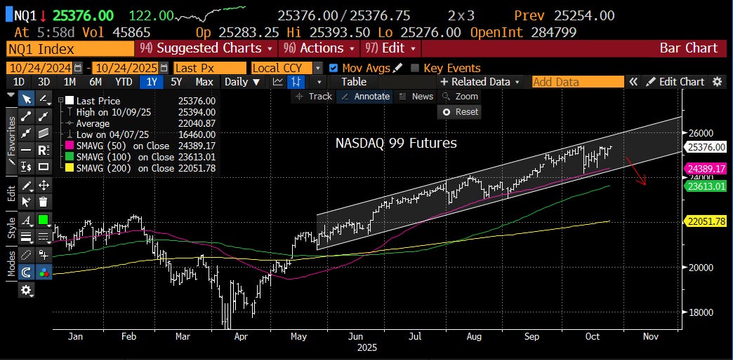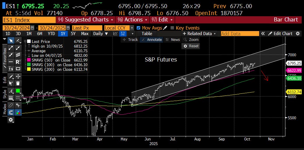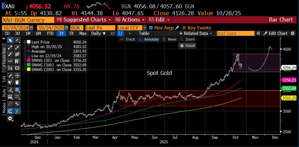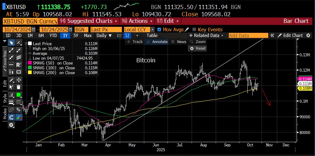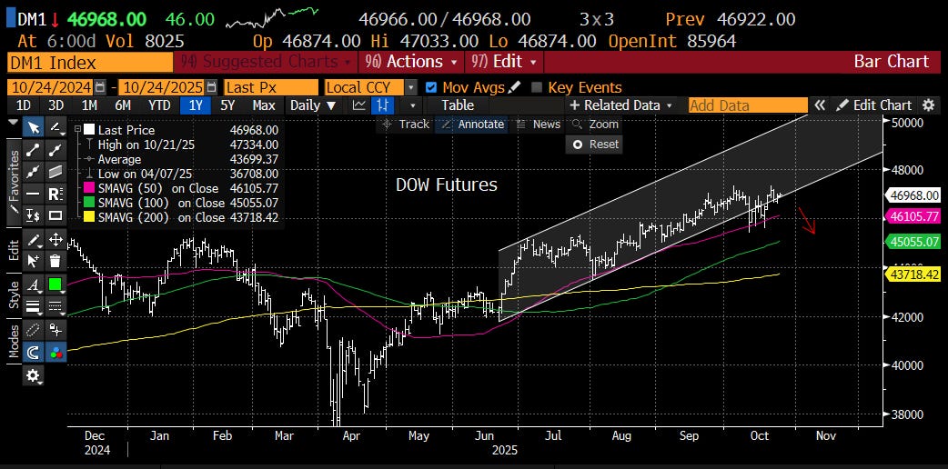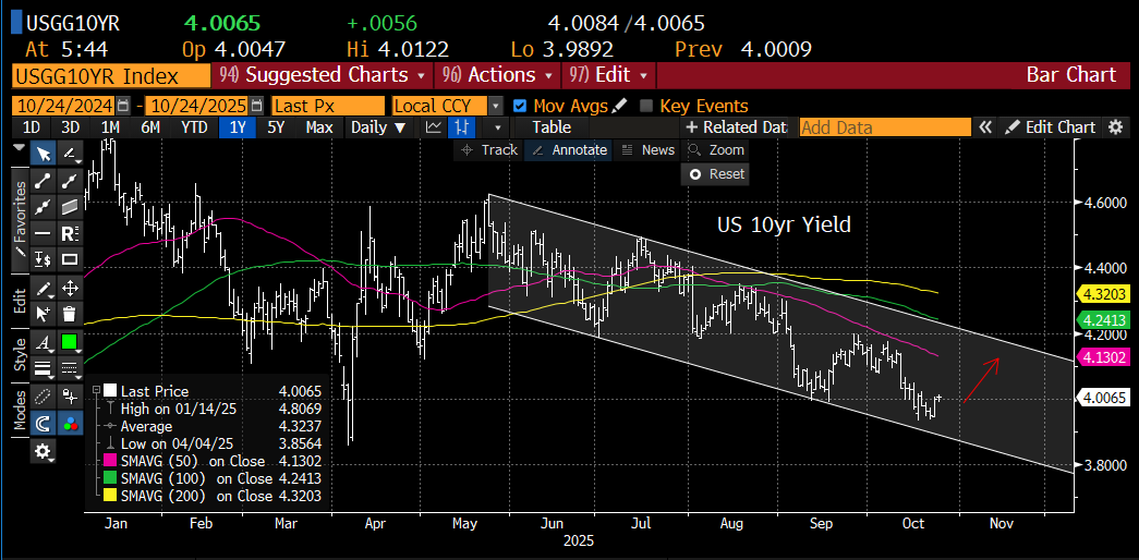 Markets rallied late yesterday and are stronger this morning because Trump confirmed the trade meeting with Xi will happen next Thursday. Scott Bessent meets today with the China trade team. I have been arguing that the China trade war is going to get worse and might lead to a complete decoupling. The WSJ has a good article today linked here. It’s titled, “China’s New Strategy for Trump: Punch Hard, Concede Little”. Gold is lower today. I think gold will find support at $4,000 to $3,900 level. Long term, I think the de-dollarization trend will continue and be reinforced by the Trump tariff wars. Near term, I think both the China trade war and the Russian-Ukraine war will continue to escalate. We get the important CPI inflation report this morning at 8 am. The report is more important because it’s the only one we are getting now that the government shutdown is a stalemate. It’s expected to be the same month-over-month, and up slightly year-over-year.