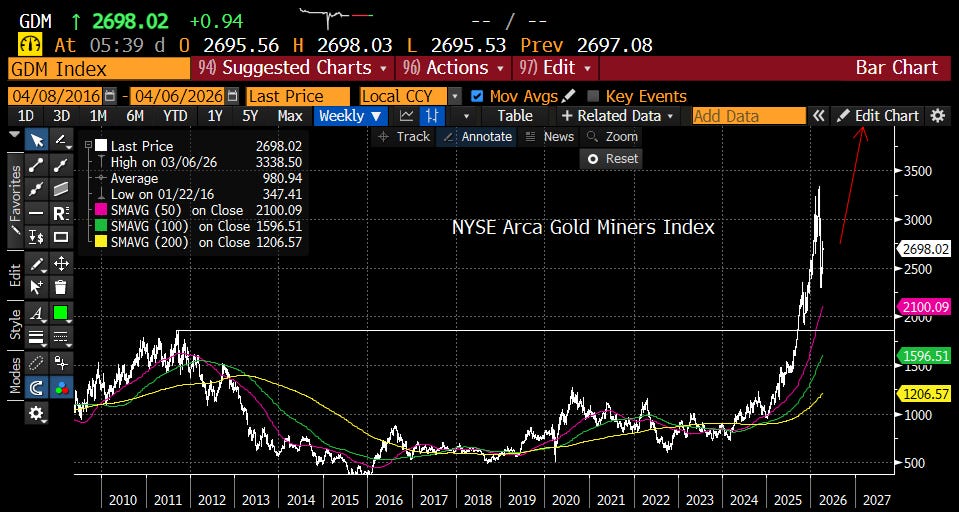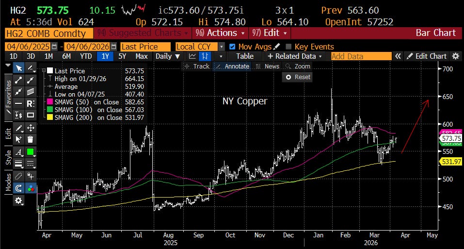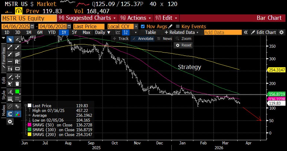 WTI crude oil is lower, and May is still the active contract, but it trades at a $14 premium to the June contract. Copper, gold, and silver are all higher. The NYSE Arca Gold Miners Index should open higher with gold prices. Bitcoin is higher and Strategy is due to open higher.