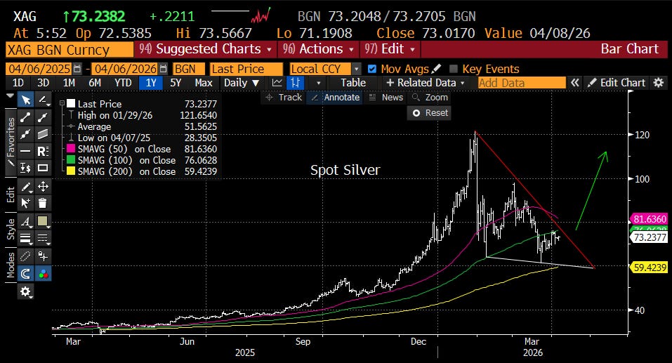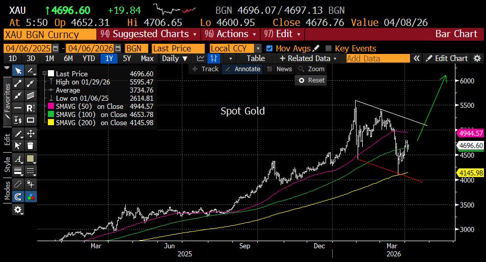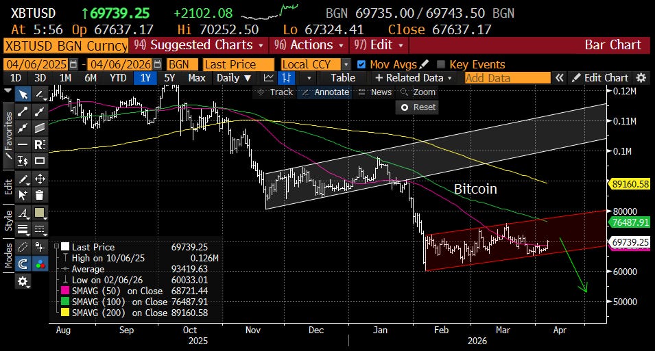 Markets are stronger this morning on hopes for a 45-day ceasefire in the Iran war. Not sure where the rumor is coming from, because Trump is still talking about “bombing Iran into the Stone Ages where they belong”. I guess the market thinks this is the week we get the full TACO. Not sure about that but we will see soon enough, Trump’s newest deadline is tomorrow. Bitcoin is higher testing $70,000. Kool-Aid Mike Saylor will report his bitcoin buying later this morning. Kool-Aid bought again last week after taking one week off. He posted his normal hint on X. “It’s a Good Friday to buy Bitcoin”. You go Kool-Aid Mike, keep on buying; someone needs to support the bitcoin market.