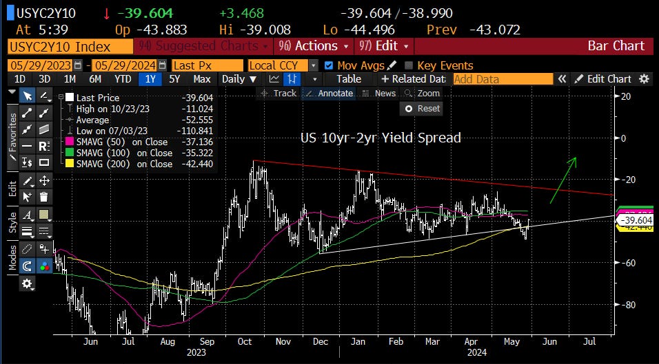 Markets are lower today following yesterday afternoon’s selloff on the smelly auction results. Yesterday was a quiet Tuesday following a long weekend so maybe it was a bad idea to hold both a 2yr and 5yr auction. Unfortunately, Janet needs to sell bonds almost everyday to fund the Tin Man’s deficits. The yield curve steepened a little yesterday after the smelly auctions. It’s a little steeper again today and is back above the 200 day. If Jay casts the easing spell next month as Paul Krugman is recommending, he will do more than save democracy. He will trigger a sharp steepening in the yield curve and a possible selloff in risk assets.