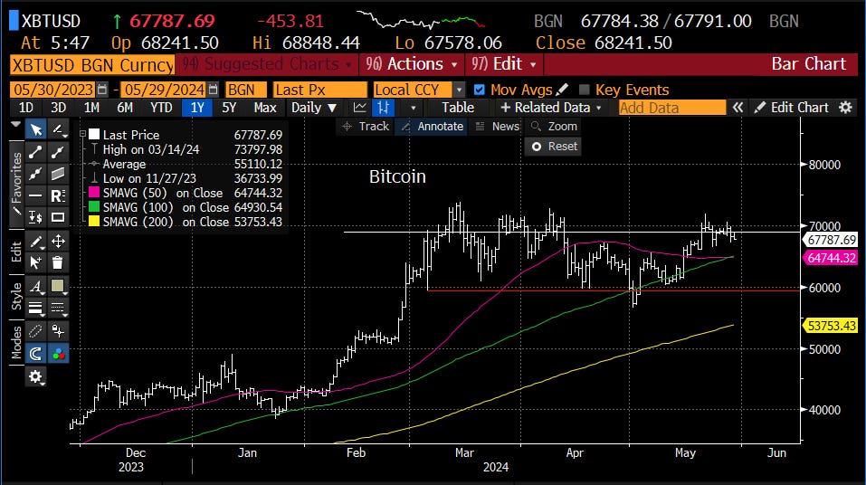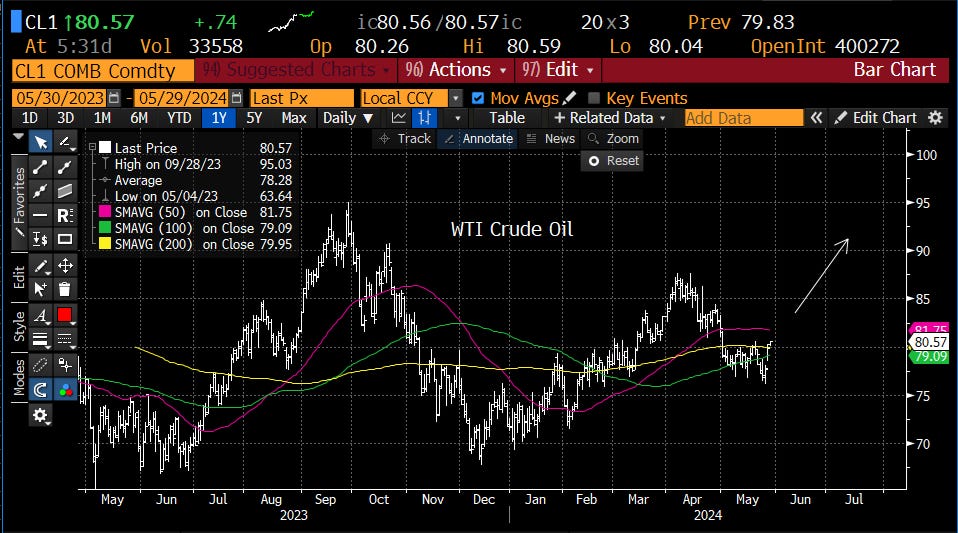 Crude oil is back above $80. Spot gold and copper are both a little lower. Bitcoin is also a little lower with other risk assets.