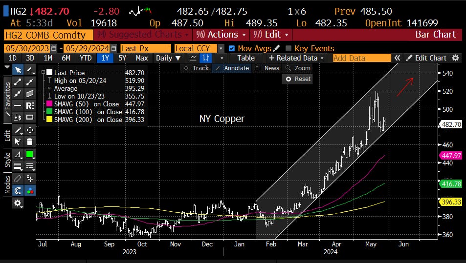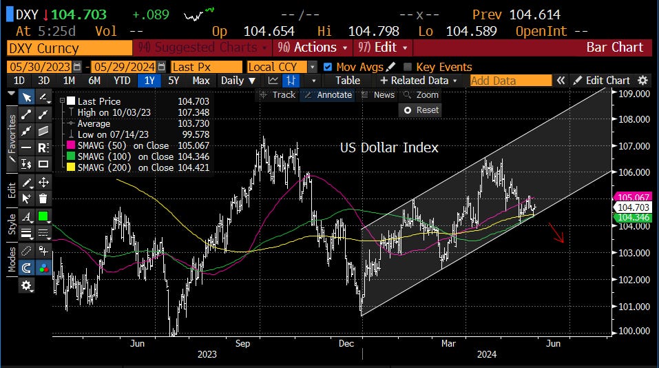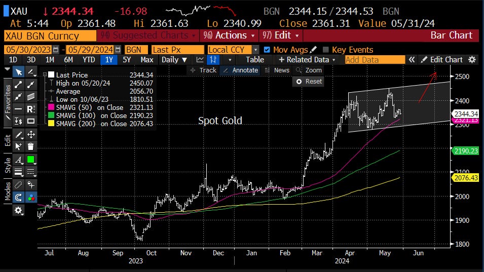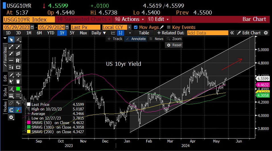 Janet Yellen, the fairy godmother of the U.S. Treasury, is having trouble selling her bonds. Janet needs some help from Jay Powell, the wizard of central banking. They both need to start casting spells on the market. Maybe Jay will cast the easing spell to save both democracy and Janet’s Treasury auctions. There were two smelly auctions yesterday, a 2yr and a 5yr. Paul Krugman, my favorite lefty economist, has been writing about smelly septic systems lately. Yesterday, Paul wrote that global warming is causing septic systems to overflow. Maybe he should start writing about the smelly auctions. Paul has been cheerleading government spending for years. He refuses to admit that fiscal deficits are one of the reasons inflation spiked 20% in the Tin Man’s first three years as president of the free world. I have been expecting Paul to call for a Fed easing and today he did. He has a new opinion article in today’s NYT, linked here. It’s titled, “On the Dangers of Inflation Brain”. Paul argues that because the ECB is going to ease in June that the Fed should also ease next month. Somehow if Jay does not ease in June it will be the Orange Mad King I’s fault. Maybe Paul should take a look at yesterday’s 2yr and 5yr auction results. That’s the septic system that is starting to overflow.