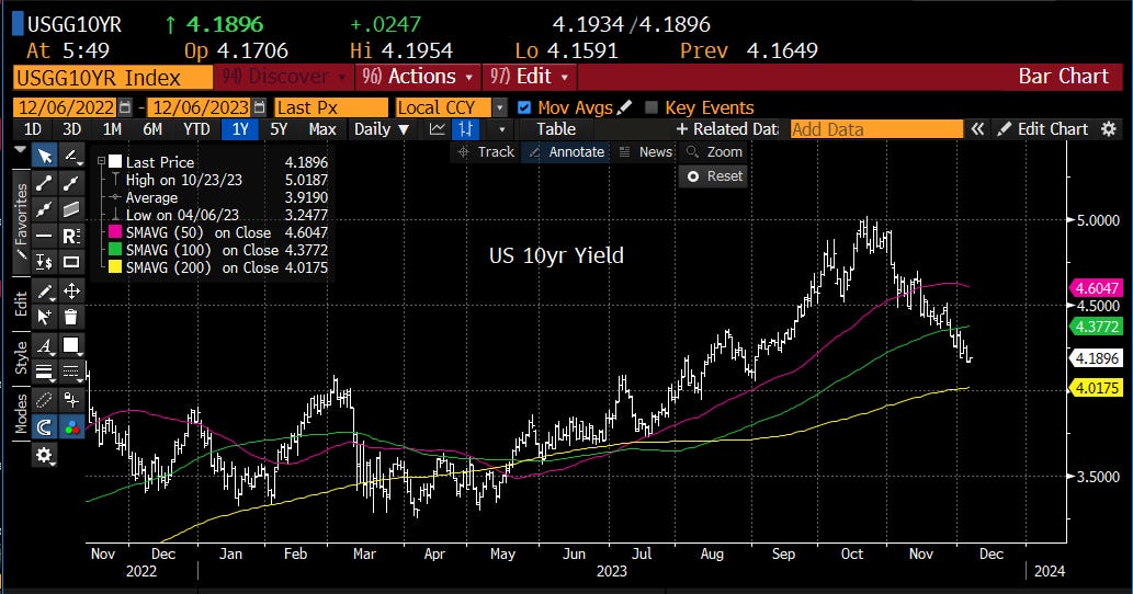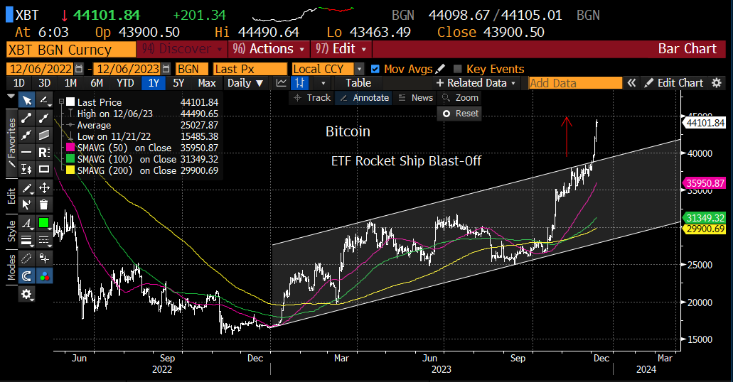 Markets are higher this morning and bitcoin is the main event this week. The bitcoin ETF rocket ship took off this week and it looks like a moonshot. Next stop Mars. We get the ADP Employment report at 8:15 this morning. It’s expected to be 130,000 up from 113,000 last month. Yesterday’s JOLTs report was a jolt. Job openings fell more than expected and 10yr yields made new lows yesterday on the softer employment report.