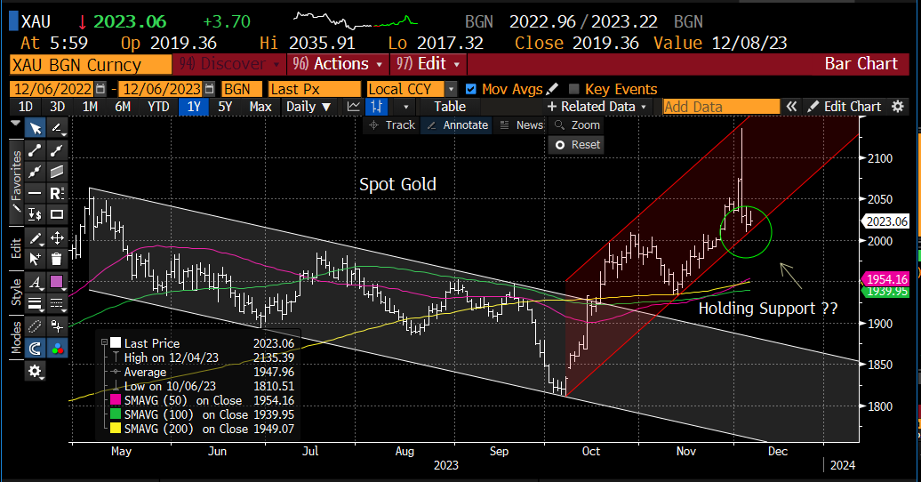 WTI crude oil is lower and starting the test the $67 to $72 support level. Gold is unchanged and holding a minor support level. Bitcoin is also unchanged but has been riding a rocket ship ETF rally this week.
