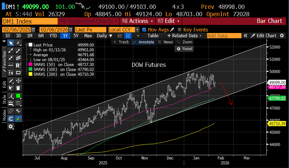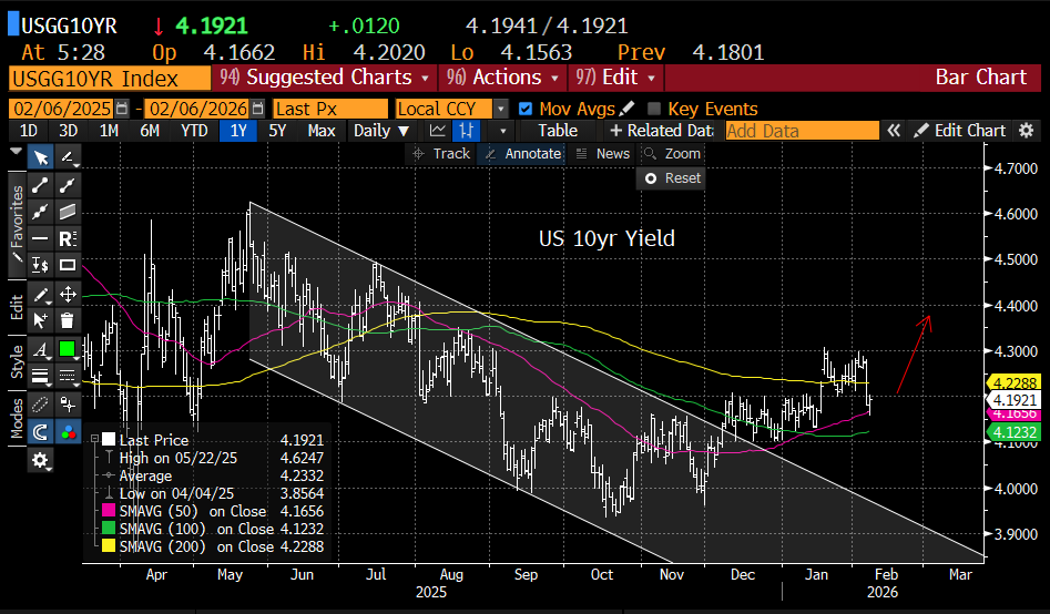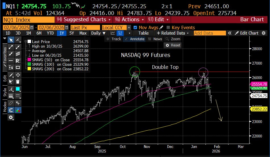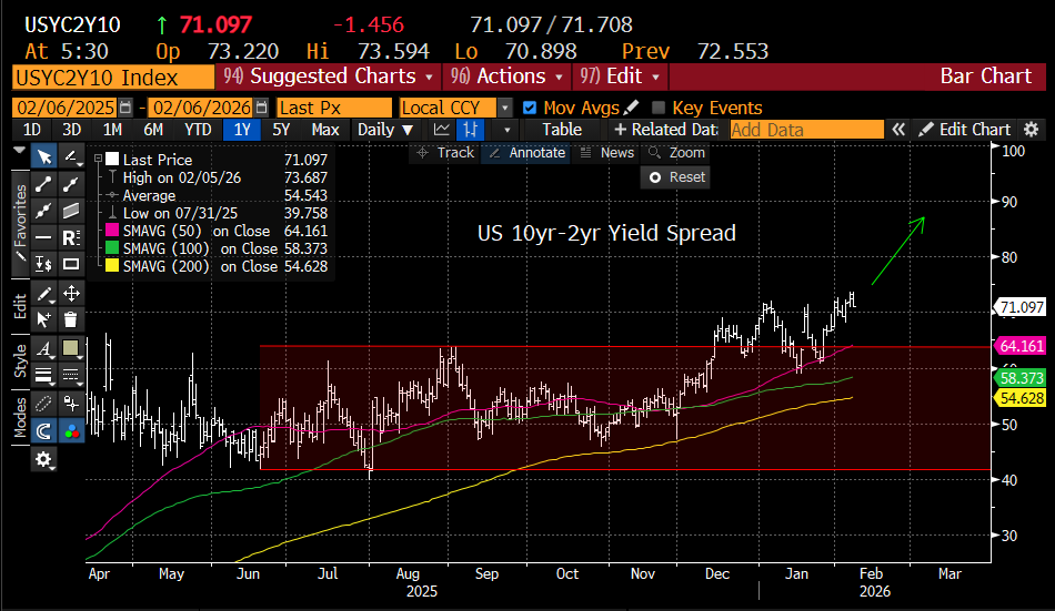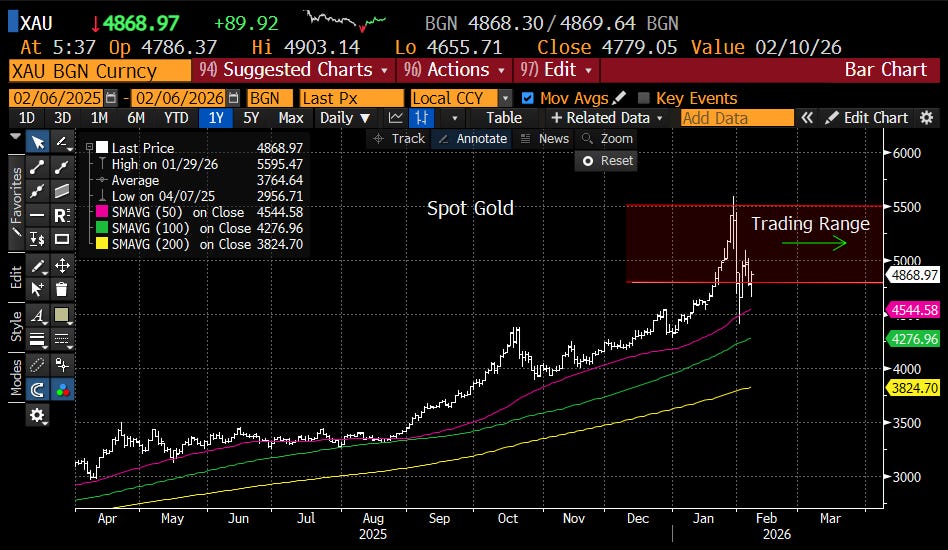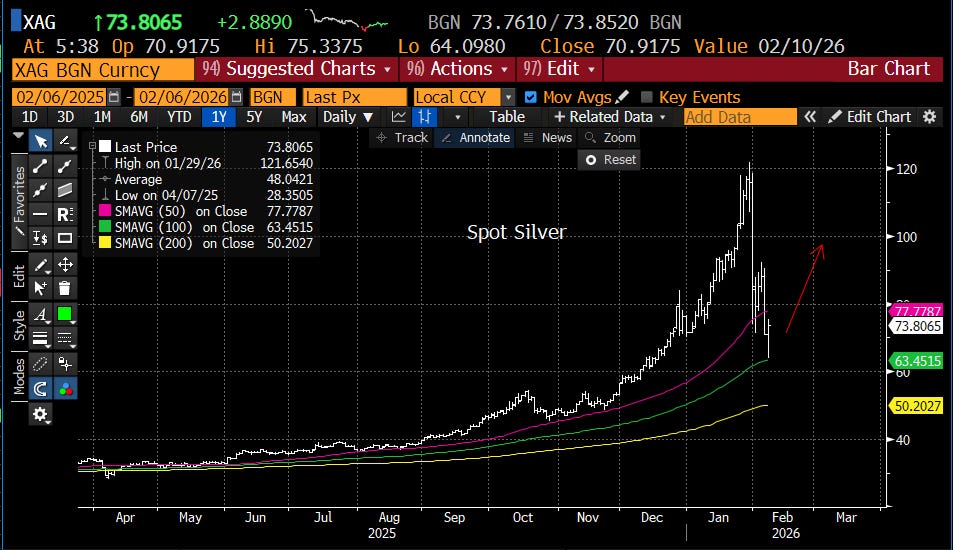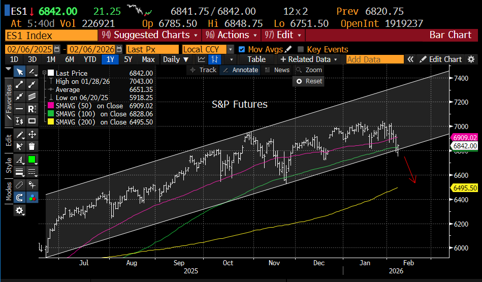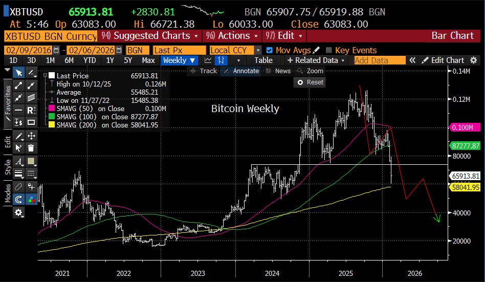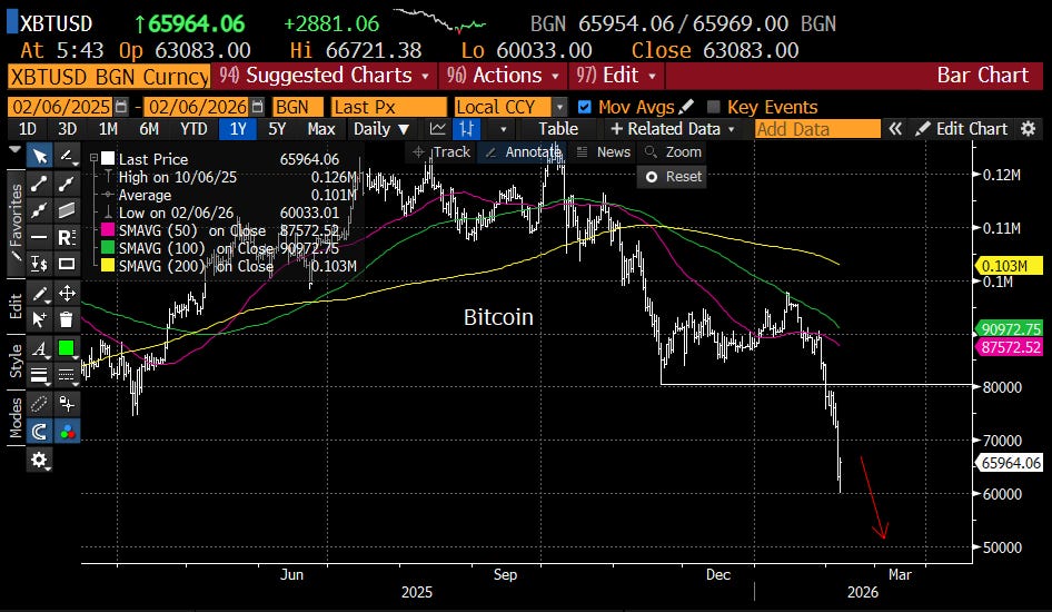 Markets have stabilized overnight after making new lows for the decline after Amazon’s earnings release. The market was spooked by Amazon’s $200 billion capex number. Equities are recovering some of yesterday’s losses. Bitcoin is also higher this morning, trading at $66,000. Gold and silver are also higher this morning. Today’s monthly employment report is delayed until next Wednesday.