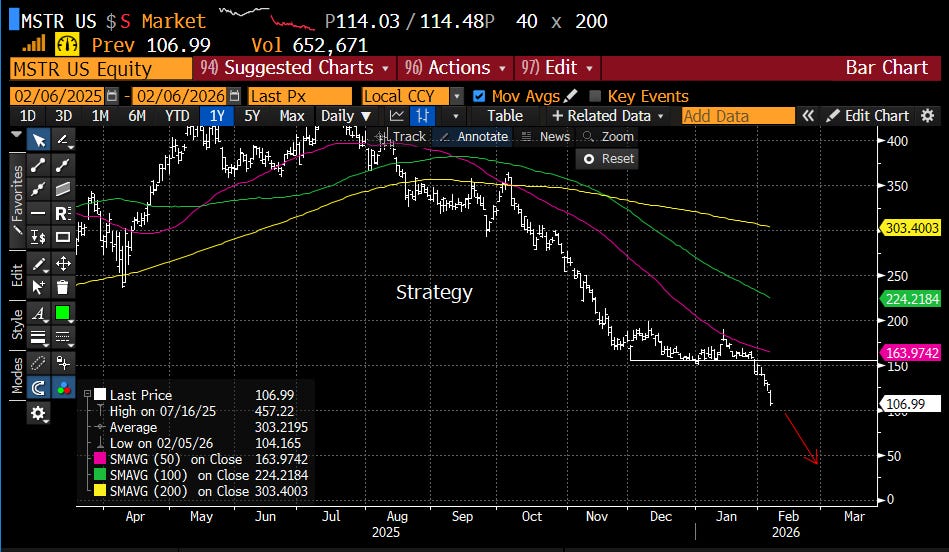 Bitcoin broke down sharply yesterday. Kool-Aid Mike Saylor didn’t seem to be bothered by the decline. He posted one word on X, HODL. Then he held his earnings call. No problems at all, just hold bitcoin forever. During the earnings call Kool-Aid Mike said that bitcoin is going higher because Trump will make it go higher. He said that Trump is bitcoin’s super power. Good luck with that one. Remember what Kool-Aid Mike says, bitcoin is going to $21 million. I’m not so sure. Bitcoin is bouncing this morning after making a new low of $60,000 overnight. On the charts I have a near term price target of $52,000, but we are due for some consolidation and maybe a bounce to $70,000. What was supposed to be a good thing, institutional buying, is now a problem. Most of the bitcoin ETF buyers are now underwater. Some of the ETF buyers might have a problem remembering why they own bitcoin. I will probably be wrong, but I think the bitcoin market is broken. The DAT model is also broken. All of the DATs in existence are now underwater and trading at a discount to their crypto currency holdings. Eric and Don Trump Jr. have big losses on their bitcoin holdings in American Bitcoin, their mining and DAT company. At the current bitcoin price miners are not making money. So Eric and Don Jr. are losing on both the DAT and the mining business.